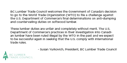 BC Lumber Trade Council welcomes the Government of Canada’s decision to go to the World Trade Organization [WTO] to file a challenge against the U.S. Department of Commerce’s final determinations on anti-dumping and countervailing duties on softwood lumber.